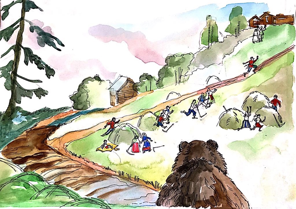 Это было теплое солнечное утро, месяц июль почти закончился и осталось буквально несколько дней до конца сенокоса. Бурый лежал у себя в берлоге и нежился в сене, которое принес еще вчера вечером – это была очень веселая история. Бурый долго ходил по лесу в поисках чего-то мягкого, что можно постелить в берлоге. Неожиданно он вышел на поляну, где шел сенокос. Медведь решил немного пошутить: встал на задние лапы, тихо подошел к краю поляны, спрятался за пнём и, когда люди присели отдохнуть, медленно, вразвалочку вышел из леса. Что там только было! Мужики и женщины побросали свои косы и припустили так, что и след простыл.