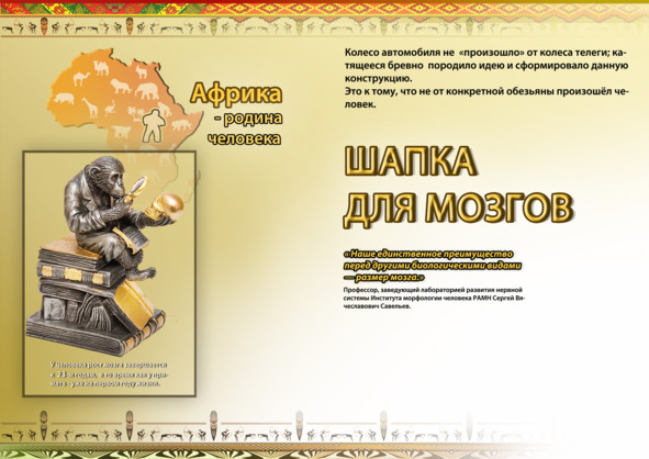 Колесо автомобиля не «произошло» от колеса телеги, катящееся бревно породило идею и сформировало данную конструкцию. Это к тому, что не от конкретной обезьяны произошёл человек. «Наше единственное преимущество перед другими биологическими видами – размер мозга». Так считает профессор, заведующий лабораторией развития нервной системы Института морфологии человека РАМН Сергей Вячеславович Савельев.