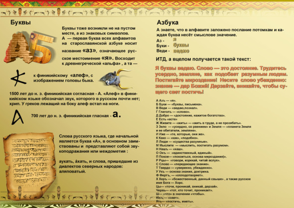 А Азъ – «я».Б Буки – «буквы, письмена».В Веди – «ведаю, познал».– «я знаю буквы»