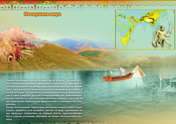 Скинув обезьянью шкуру и повесив её в шкаф, человечество с большим усердием принялось созидать: и хорошее и плохое. Настроив по всему миру пирамид, акведуков и колизеев, человечество, кажется навечно, увековечивало себя в своей истории. Но нет ничего постоянного и всё изменчиво, как и сама природа, потопы и наводнения, как набежавшая волна смыли все достижения человека-творца. И всё это будет приписано неведомым пришельцам и невидимому Создателю.