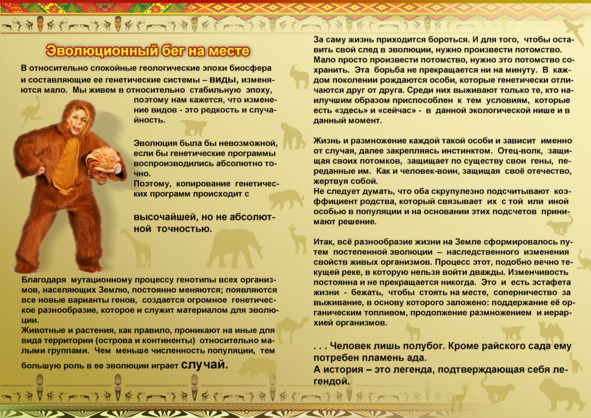 Итак, всё разнообразие жизни на Земле сформировалось путем постепенной эволюции – наследственного изменения свойств живых организмов. Процесс этот, подобно вечно текущей реке, в которую нельзя войти дважды. Изменчивость постоянна и не прекращается никогда. Это и есть эстафета жизни – бежать, чтобы стоять на месте, соперничество за выживание, в основу которого заложено: поддержание её органическим топливом, продолжение размножением и иерархией организмов.