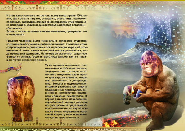 Предком человека изначально было волосатое существо, получившее облучение в рифтовой долине. Оголение кожи сопровождалось развитием подкожного жира и её потемнением. А затем снова, волосяной покров увеличился, когда произошла адаптация. На голове он выполнял защитные функции от солнца.