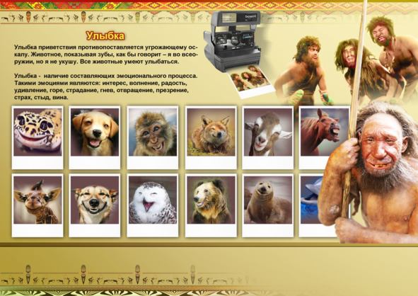 В природе всё рационально. А улыбнулся человек ещё, будучи зверем. Улыбка приветствия противопоставляется угрожающему оскалу. Животное, показывая зубы, как бы говорит – я во всеоружии, но я не укушу. Животные, относящиеся к млекопитающим, тоже умеют улыбаться. Улыбка – наличие составляющих эмоционального процесса. Такими эмоциями являются: интерес, волнение, радость, удивление, горе, страдание, гнев, отвращение, презрение, страх, стыд, вина.