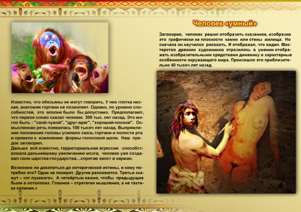 Предполагают, что первое слово сказал человек 300 тыс. лет назад. Это могло быть: «свой-чужой», «друг-враг», «хороший-плохой». Осмысленная речь появилась 100 тысяч лет назад. Выпрямление положения головы усилило связь гортани и полости рта и привело к изменению формы голосовой щели. Наш предок заговорил.