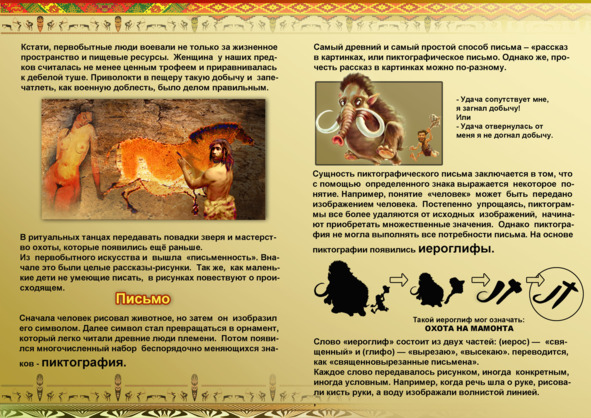 Из первобытного искусства и вышла «письменность». Вначале это были целые рассказы-рисунки. Так же, как маленькие дети не умеющие писать, в рисунках повествуют о происходящем.