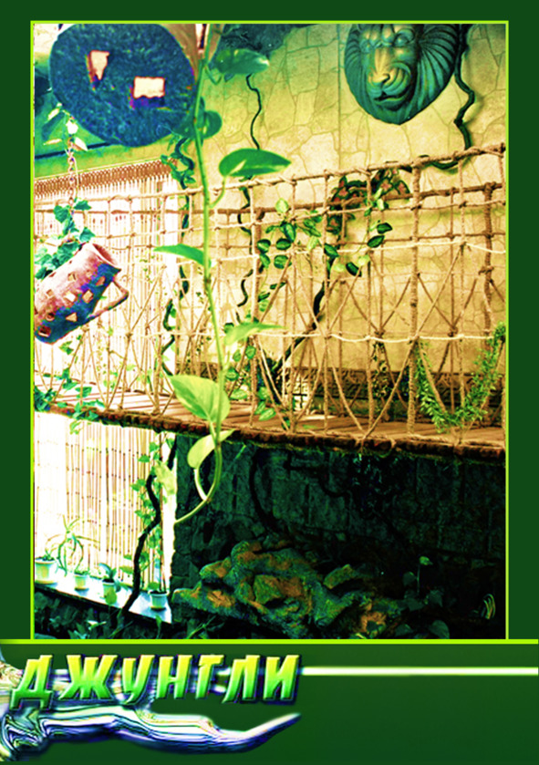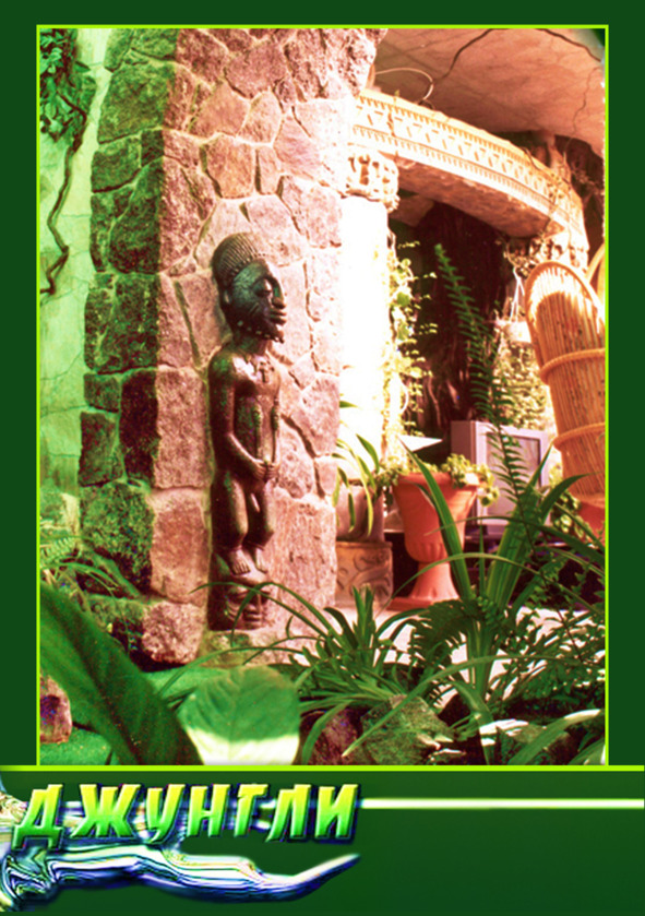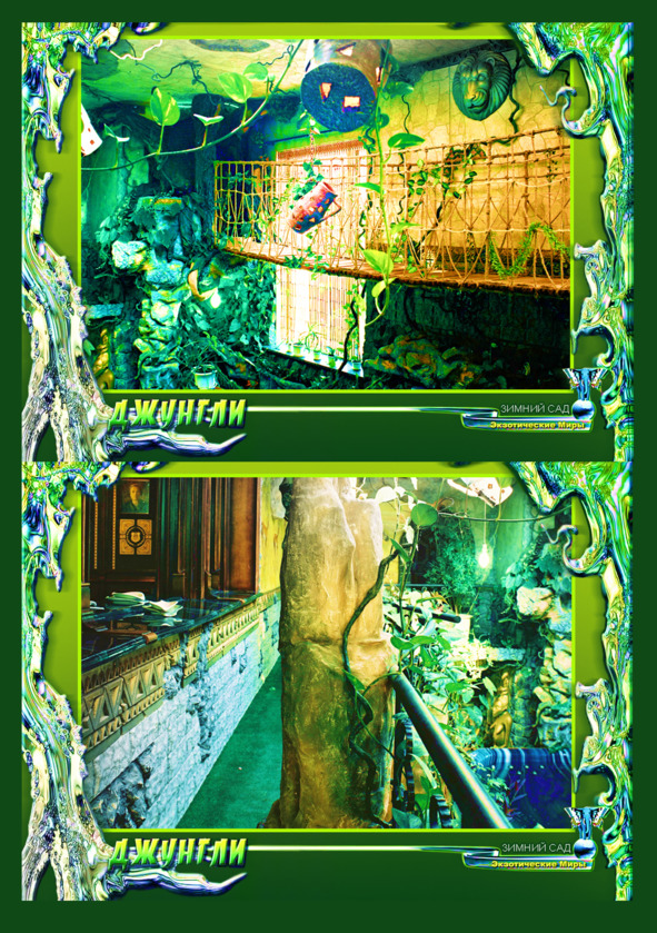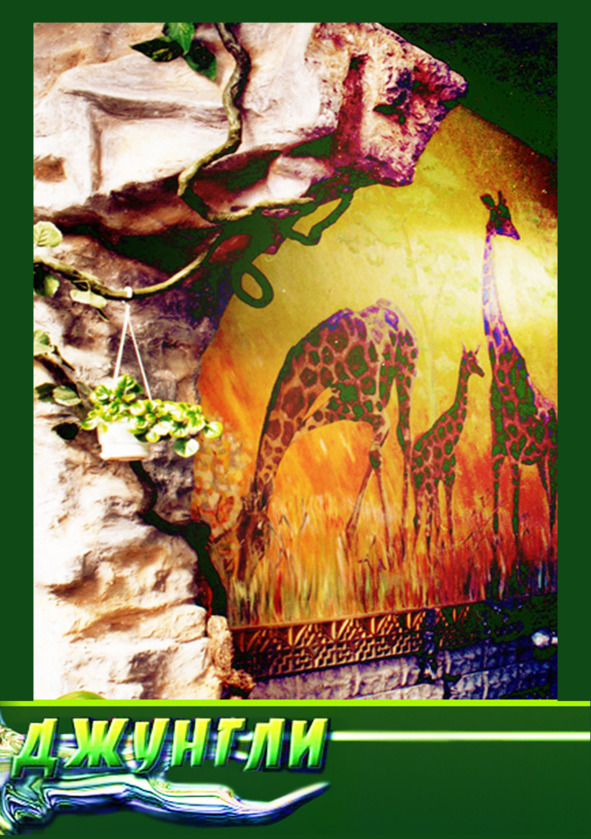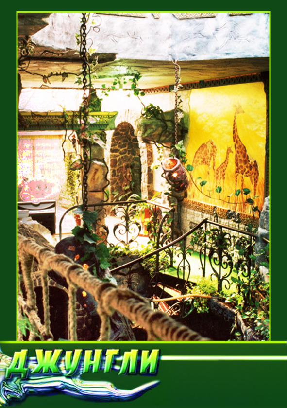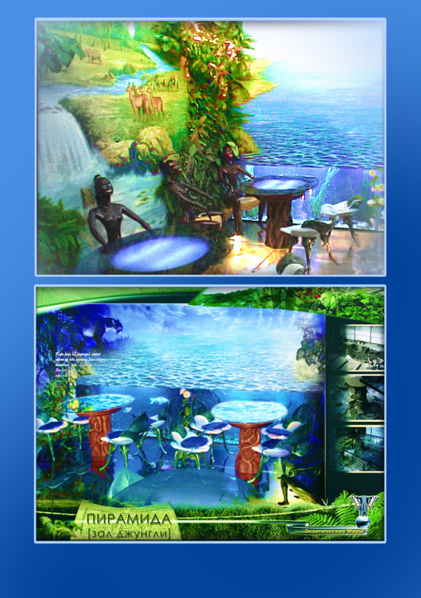 Над головой мерцающие созвездия звёздного неба – натяжного потолка. Величественные расписные колонны с настенными фресками и иероглифами. На плоскости стен изображения занятий древних египтян. Всё вокруг загадочно и неповторимо… Уникальная барная стойка сияет медным блеском и по стальной плоскости стекают струи воды. Бронзовые барные сидения в виде песчаных кобр. А через весь зал, под стеклянной плоскостью протекает голубой Нил через жёлтый ковролин. Стремительная вода журчит и светится. Извивающееся русло переходит в другой зал со стеклянным полом, где в свете подводных светильников застывшие формы, рыб, черепах и крокодила. Этот зал стоит прямо на воде, а одна стена сплошной огромный аквариум с экзотическими рыбами и живописной плоскостью огромной африканской реки. Другие плоскости стен – панорама африканской саванны и джунглей с рельефами и скульптурными формами птиц и обезьян. И огромная львица застыла под потолком, словно в прыжке… Ножки столов, словно выступающие стволы деревьев из воды, с прозрачными столешницами из голубого стекла. Пепельницы с египетской стилистикой. Слышен шум воды, крики суетящихся мартышек и попугаев. Далёкий и зычный львиный рык. Здесь предостаточно художественных эффектов: цветовых и световых. Интересны и уникальны рельефы и формы: скал, камней, животных.