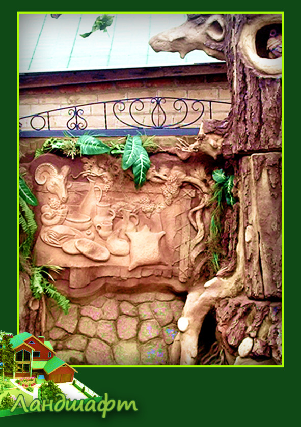 Тематический барельеф у мангала и ствола дерева/внутри винная ёмкость/.