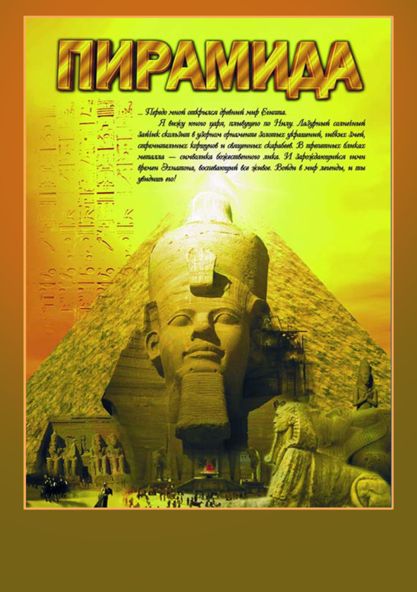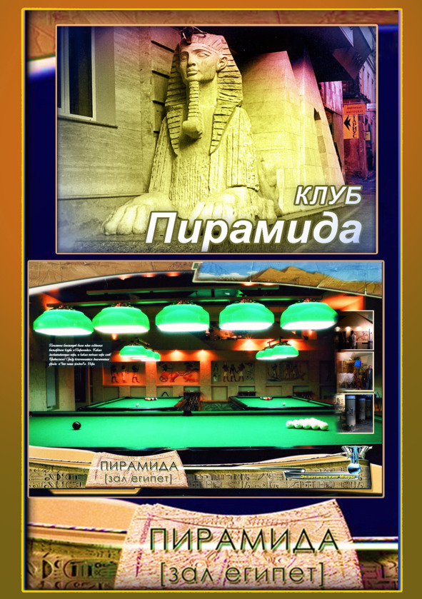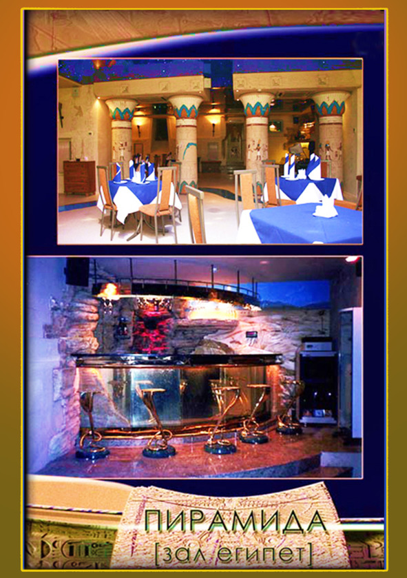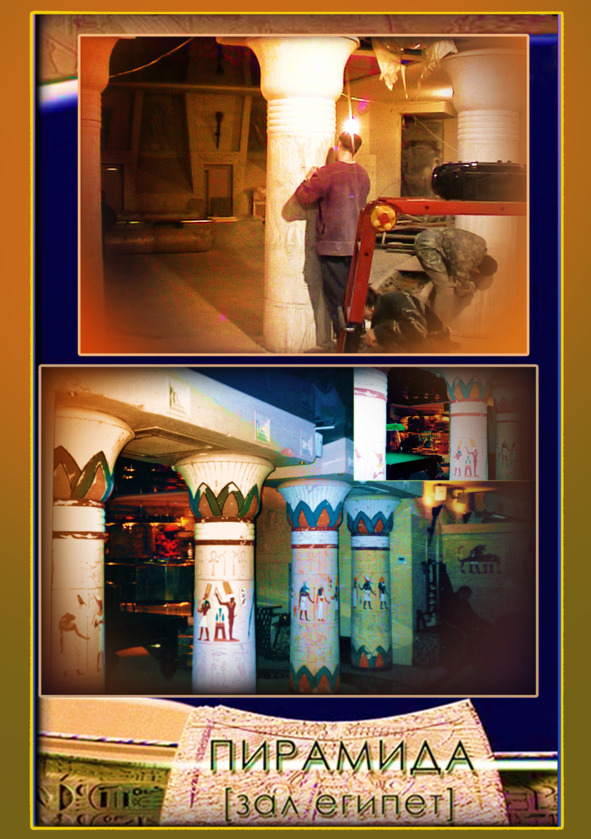Начиналось всё с небольшого подвального помещения, высотой до полутора метров… Решение было найдено, и высота помещения была увеличена до 4-х метров, за счёт выборки напольного грунта. В это время готовилась предпроектная документация и макет будущего клуба «Пирамида». В «Экзотические Миры» была приглашена консультант из Кении и задействованы прежние профессионалы и мастера. Работа кипела днём и ночью. Заказчик то был очарован экзотическим исполнением, то нервничал и капризничал. Даже затребовал подтверждения в Институте востоковедения, что египетские иероглифы на стенах и колоннах зала не содержат проклятий… Дабы где-то, в далёких песках Египта не воскресла злобная мумия Аменхотепа и не явилась на презентацию ресторана… Всё обошлось, проклятья не были обнаружены… Их там и не было.