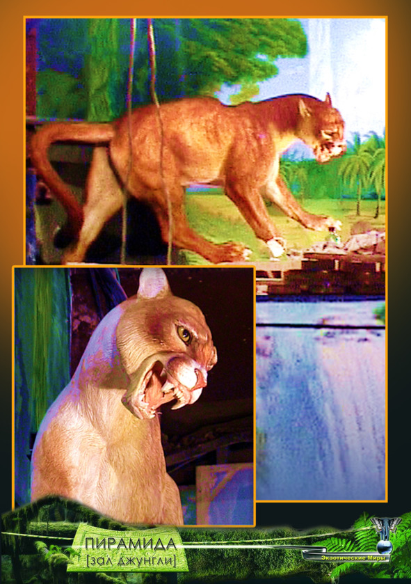 Зал джунгли и скульптура прыгающей львицы. Напротив неё – панно «Львы».