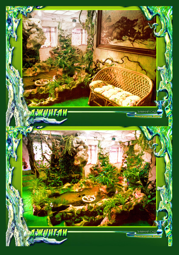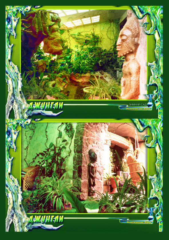 Зимние сады от «Экзотических Миров» навеяны сказочностью. Это может быть волшебный ландшафт Мадагаскара или джунгли мальтийского побережья с фрагментами воскресших легенд острова Пасхи. Апофеоз романтики «Экзотических Миров», повсюду. Это может быть и фрагмент африканской саванны с разрушенным городом солнца Сан-Сити, где мастера сооружают развалины, профессионально имитируя природные трещины на камнях, надёжно закрепляя над искусственной расщелиной «ветхие» подвесные мосты, опутанные гибкими лианами, возводя сооружения древности по технологии «экзотического» строительства.