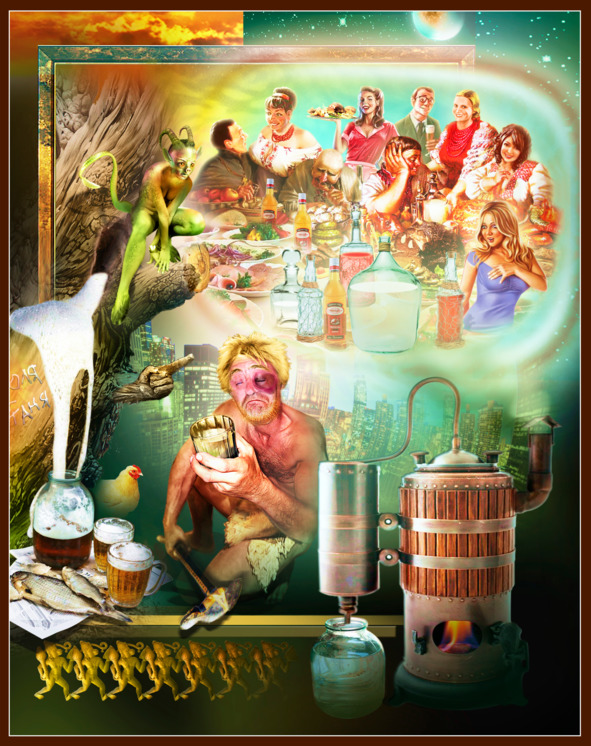 В районном центре, на пивной, хлопала на ветру афиша. Последнюю гастроль проездом давал доктор-чародей. Корифей медицины. Алкогольный недуг он снимал, как порчу, по-научному. За один сеанс, как Хоттабыч, исцелял нутро, превращая красный портвейн, богатый алкалоидами, в питательный томатный сок, богатый витаминами. Подрывая принародно авторитет вседержателя «ивашки хмельницкого». Бес ему в ребро. А из его ребра извлекал вопящую, чистую лимонадную душу…