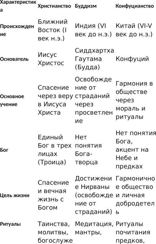 – Ритуалы: Христианство – таинства и богослужения. Буддизм – медитация и пуджи. Конфуцианство – ритуалы почитания предков и церемонии.