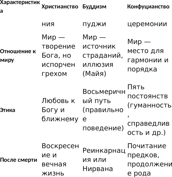 – Отношение к миру: Христианство видит мир как творение Бога, но испорченное грехом. Буддизм рассматривает мир как источник страданий и иллюзий. Конфуцианство стремится к гармонии и порядку в мире.