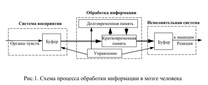 Биологический нейрон в ответ на возбуждение может генерировать нервный импульс, распространяющийся вдоль аксона. Его форма и скорость распространения не зависят от того, как и из-за чего он возник. Доходя до конца аксона, он вызывает выделение веществ, называемых нейромедиаторами. Воздействуя на дендриты других нейронов, они могут в свою очередь вызвать появление в них нервных импульсов. Другими словами, на этом уровне развития когнитивных наук нейрон трактовался как управляемый логический элемент. На сегодняшний день эта модель выглядит крайне упрощенной. Нейрофизиологи выявили множество механизмов управления нейроном, и они действуют в сложной иерархической взаимосвязи. Взаимодействующие между собой посредством передачи возбуждений нейроны формируют нейронные сети. К настоящему времени уже есть основания рассматривать каждый нейрон как отдельный компьютер или даже как компьютерную сеть. Процессы обработки информации в мозгу человека не совпадают с аналогичными процессами в компьютере. Человек получает информацию из внешнего мира от своих пяти органов чувств, которая помещается в буфер кратковременной памяти для анализа, рис.1.2.