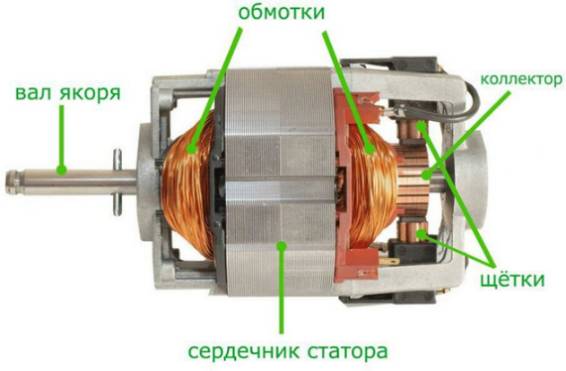 Коллекторный мотор состоит из корпуса, внутри него находятся магниты – плюс и минус, корпус неподвижен, а в движение приводится ротор с обмоткой с помощью щеток, которые подают электричество на обмотку. Преимущества: низкая стоимость, простота конструкции.