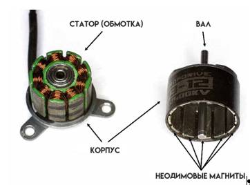 Бесколлекторные моторы. Все бесколлекторные (бесщеточные) моторы состоят из 4 компонентов: статор (обмотка), корпус, вал, неодимовые магниты, рис. 2.21.