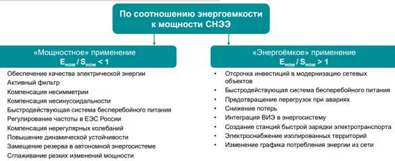 Классификация направлений применения СНЭЭ по соотношению энергоемкости к мощности СНЭЭ представлена на рис.2.6, а по типу энергосистемы- на рис. 2.7.