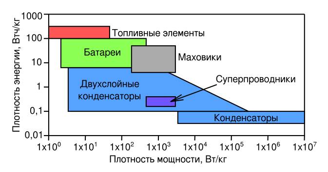 Накопители энергии представляют собой системы, которые хранят энергию в различных формах, с использованием, топливных элементов, батарей, конденсаторов, маховиков, сжатого воздуха, гидроаккумуляторов, суперпроводников и т. д. Распределение различных видов накопителей энергии по плотности и мощности энергии представлено на рис.3.1.