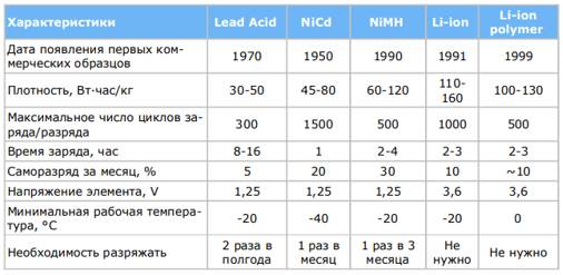 Сравнительные характеристики данных батарей представлены в таблице 3.1.