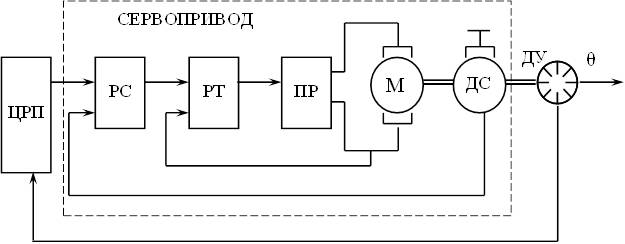 Первый контур образован двигателем (М) с преобразователем (ПР) и регулятором тока (РТ). Во второй контур входят датчик скорости (ДС) и регулятор скорости (РС). В состав третьего контура дополнительно входят датчик угла (ДУ) и цифровой регулятор положения (ЦРП).
