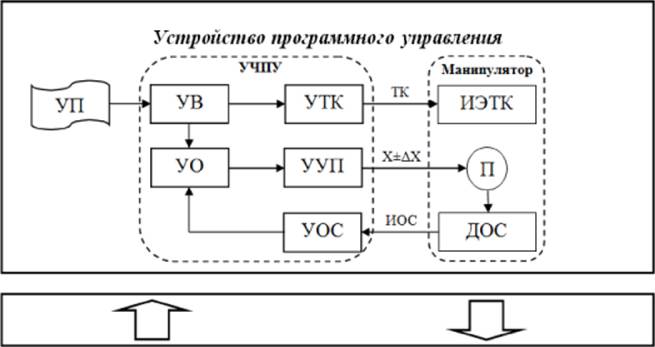 УП—управляющая программа; УВ—устройство ввода; УО—устройство обработки; УУП—устройство управления приводом; УТК—устройство технических команд; УОС—устройство обратной связи; ИЭТК—исполнительные элементы технологических команд; П—привод; ДОС—датчик обратной связи; ТК—технологическая команда; ИОС—информация обратной связи.