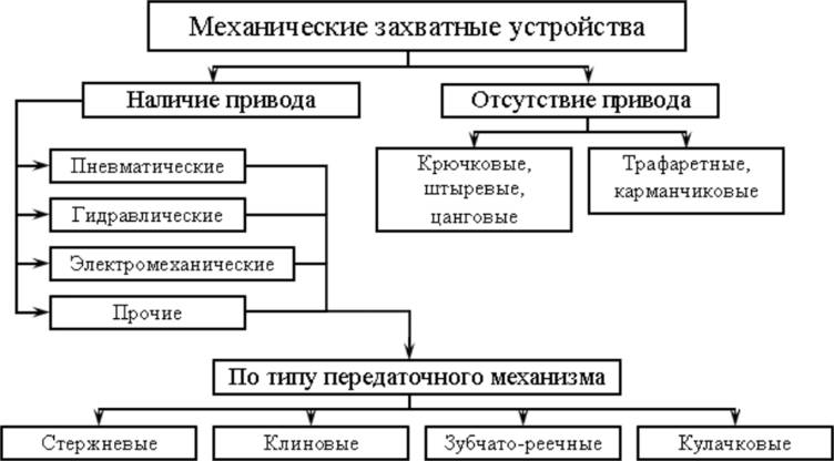 Поскольку в машиностроении широкое распространение получили ПР с механическими захватами, приведем классификацию механических ЗУ по наличию и типу привода и типу передаточного механизма, рис. 3.19.