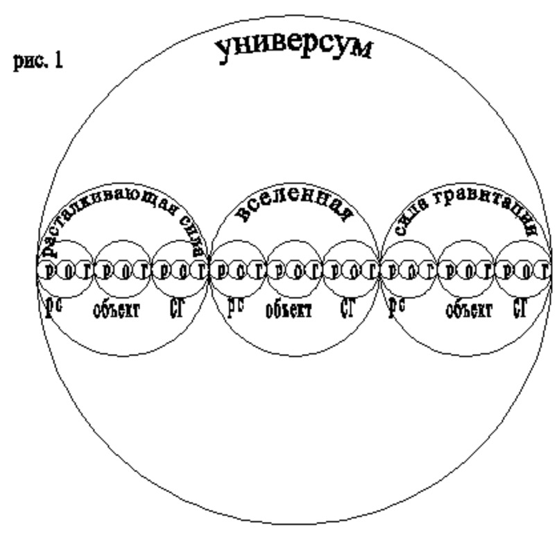 Данная схема дает возможность показать связь между явлениями на любых уровнях мироздания. Например, если принять, что малые окружности здесь соответствуют отдельным организмам, то эти организмы являются составной частью окружности, олицетворяющей семью, в которой одна из окружностей соответствует мужской особи, другая – женской, а средняя – плоду, как результату их взаимодействия. Здесь единство и противоположность мужского и женского начал обеспечивает процесс воспроизводства. В свою очередь, три семьи составляют стадо, где его единство включает в себя внутривидовую борьбу, обеспечивая совершенствование вида. Следующие три окружности составляют среду, где отбор наиболее приспособленных видов обеспечивает борьба межвидовая. И, наконец, на планетарном уровне через противостояние мира органического и мира неорганического формируются условия для возникновения жизни как таковой. Что же касается самого большого круга, то он олицетворяет собой универсум, в котором, силами притяжения и отталкивания формируется вселенная. В целом же вселенная организована таким образом, что все ее устройство отражается в каждом, даже самом малом фрагменте поля, а любой самый малый фрагмент поля во всей полноте содержит в себе вселенную17.