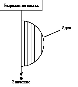 Выражения языка можно рассматривать как знаки. Знак, в таком контексте, ─ это выражение, обозначающее какой-то предмет. Под предметом понимается все, что может быть как-то названо. Примеры знаков: река Волга, кошка. Предметным значением (или просто значением) выражения «река Волга» является сама эта река, а смысловым значением ─ какая-то из информаций о Волге, выраженная в языке, например, информация о том, что это самая большая река в Европе, а также зрительный образ этой реки или какое-то иное представление о Волге. Первый вид смыслового значения (самая большая река в Европе) называется смыслом знака, а второй ─ образным представлением. Образное представление называется также идеей. Знаковую ситуацию можно представить графически: