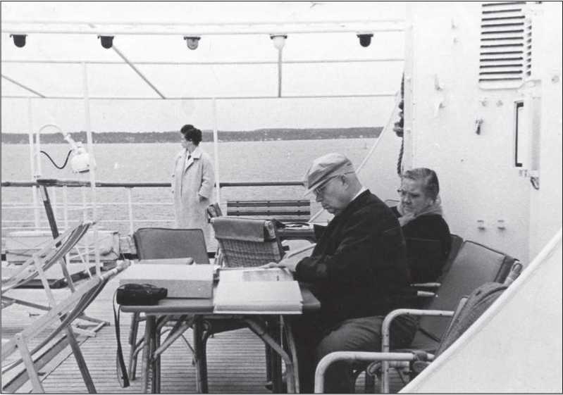 На борту теплохода «Башкирия» во время официального визита в Скандинавию. Слева направо: Ю. Л. Хрущева, Н. С. Хрущев, Н. П. Кухарчук
