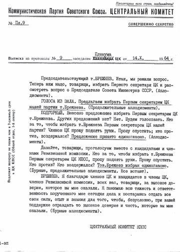 Выписка из протокола № 9 заседания Пленума ЦК КПСС от 14 октября 1964 г.