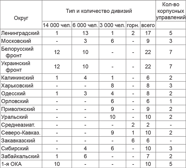 Из 173 стрелковых дивизий Красной Армии только 46 дивизий за 39—40-е годы будут развернуты до полного штата мирного времени, и их будет можно считать нормальными дивизиями, еще 64 дивизии будут иметь половинный состав, а остальные будут иметь четверть личного состава.