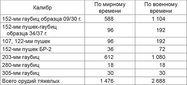 – 12 гаубичных полков 152-мм гаубиц образца 09/30 г. по 48 орудий, численность полка – 1 361 чел. из этих 12 полков 9 полков имеют двойное развертывание;