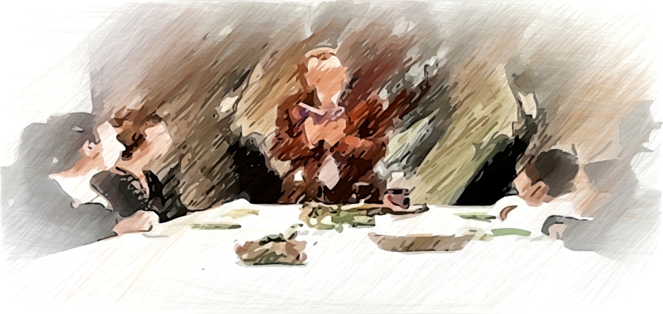 … В гостиной, за большим столом с яствами сидит его семья.; немолодая, располневшая жена, трое детей, двое мальчиков с кипами на макушках и девочка с серьёзным, торжественным лицом.