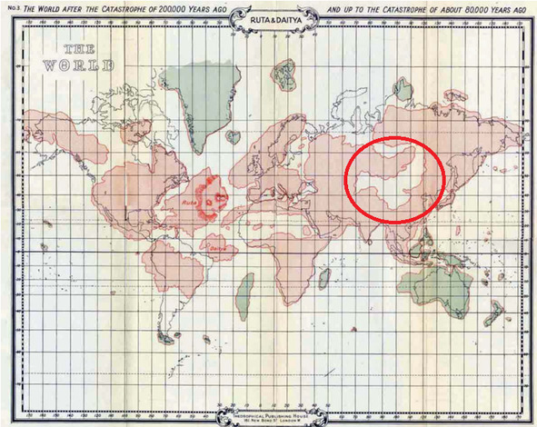 Учение, изложенное Е. Блаватской в «Тайной Доктрине», говорит, что задолго до гибели Атлантиды на берегах Центрально-азиатского моря, в тех местах, где сейчас раскинулись таинственные пустыни, обрели свою родину те, кто стал родоначальником и полноправным представителем тогда ещё зарождающейся Пятой Коренной Арийской Расы. Это море видно на картах (Рис. 1), которые были представлены в книге Скотта-Эллиота «История Атлантиды». Племена, которые Ману отделил для созидания новой Коренной Расы, проложили себе путь к Центрально-азиатскому морю, что произошло примерно 80 тыс. лет назад (л.н.). Там-то и была основана первая Арийская империя, откуда Раса и распространилась по разным частям земного шара. Именно от этого расселения начинается настоящая история нашей цивилизации, существующей сейчас на планете Земля. Из Центральной Азии вследствие центробежного импульса стали расселяться народы Арийской расы, неся новое сознание и культуру на новые земли. Истоки величайших культур древности, каковыми были культуры Индии, отчасти Египта и другие, получили своё развитие благодаря духовным началам, исходящим из Центральной Азии.