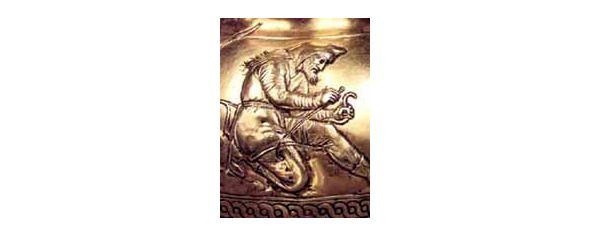 В нашем распоряжении имеются изображения конных скифов: на концах золотой гривны – шейного украшения, сцена воинского братания скифов на золотой пластинке, располагавшейся в нижней зоне одежды погребённого, скиф на вазе из кургана Куль-Оба (Крым, 4 в до н.э.); чаша-братина из кургана «Гайманова могила» у села Балки, Запорожской области (4 в до н.э.). Обратите внимание, что точно такие же причёски и бороды носила русская знать вплоть до 17 в. Причём, на чаше-братине волосы и бороды выполнены из золота, что показывает, что скифы были светловолосым европеоидным народом, а их упорно рисуют тюркообразными с чёрными волосами и глазами.
