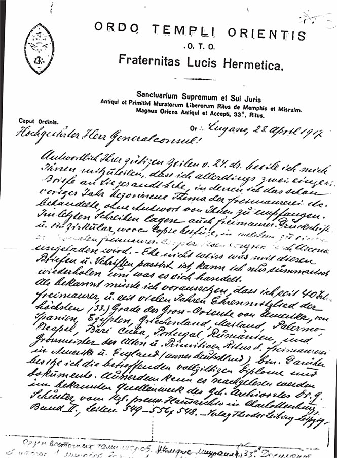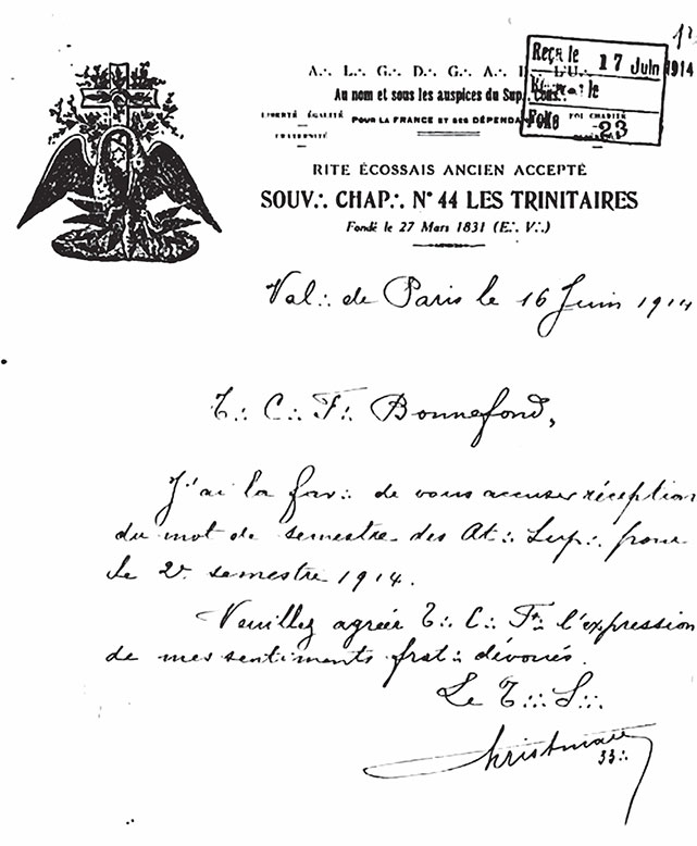 Переписка парижских лож накануне Первой мировой войны. Пеликан, который кормит птенцов своим телом – масонский символ жертвенности, однако «братьями» (обозначаемыми тремя точками) вынашивались отнюдь не альтруистические планы.
