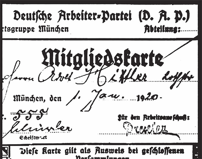 Через несколько дней Гитлер получил конверт. В нем был партийный билет под номером 555. Фактически будущий фюрер стал пятьдесят пятым. За счет «сотен» партия просто пыталась создать иллюзию многочисленности.