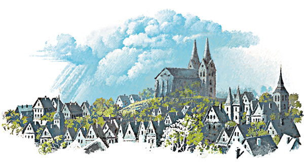Отсюда был виден весь Юрьев. За прибрежным лугом, на котором паслась скотина горожан, тянулась светло-серая городская стена с толстыми башнями. В каждой из башен зияли ворота. Из-за стены выглядывали черепичные крыши и церковные шпили, а за ними возвышались два зелёных холма. На одном стоял епископов замок, на другом – Домский собор.