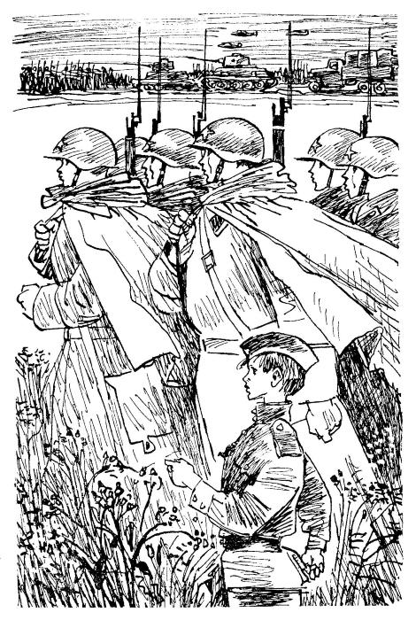 Солдаты держали в руках длинные винтовки с прим-кнутыми штыками и смотрели вперед. Серёжу и деда они не замечали, а может быть, принимали за своих – большой солдат и маленький.