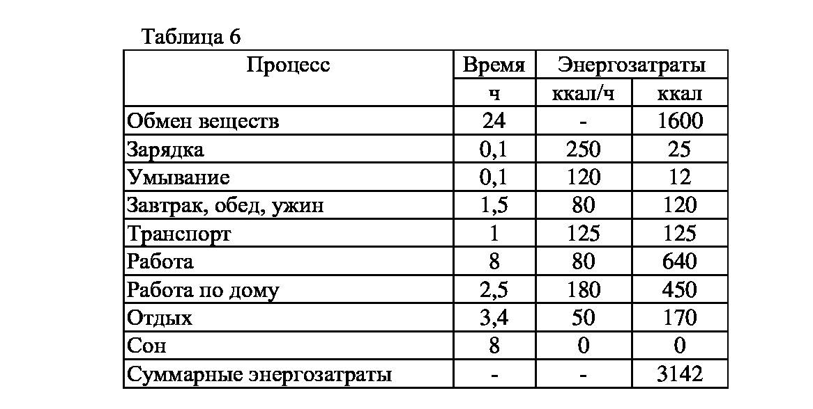 Основные энергозатраты приходятся на 8-часовой рабочий день – 640 ккал. Достаточно высоки затраты по уходу за домом – за 2,5 часа 450 ккал. Общие затраты энергии превышают 3100 ккал.