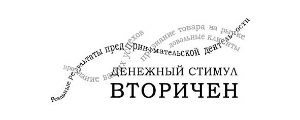 В идеале денежный стимул вторичен. Он возникает и развивается только тогда, когда появляются реальные результаты предпринимательской деятельности: причёcки, которыми довольны клиенты в вашей частной парикмахерской; булочки в семейной кондитерской, за которыми утром выстраивается длинная очередь; дизайн квартиры, которую вы оформили своими руками и за которую не стыдно перед самым придирчивым заказчиком. Только когда рынок начнёт вас признавать и платить вам, денежный стимул заработает как мотив к развитию бизнеса. Прибыль и оборот – всего лишь будущие критерии успешности. Как только вы получите свой первый результат, отработаете первую сделку, завершите построение своего первого технологического или производственного процесса, реализуете свой первый товар, тогда и превратите этот процесс в постоянно работающий доходный бизнес.