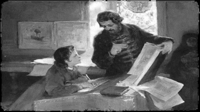 Дьяк Никита Зотов обучает царевича Петра Алексеевича грамоте. Худ. К. Лебедев. 1903 г.