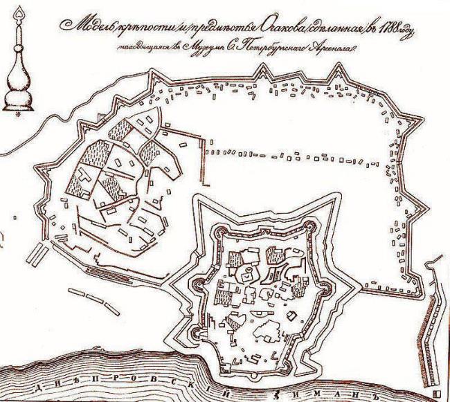 Днепровскому лиману. Со стороны суши каменная стена крепости была обнесена валом и рвом глубиной около 7 метров. На подступах к крепости находилась первая линия защитных укреплений – нагорный ретраншемент (франц. окоп; большое полевое укрепление), включавший в себя ров и вал, которая представляла собой самостоятельный укрепленный лагерь.