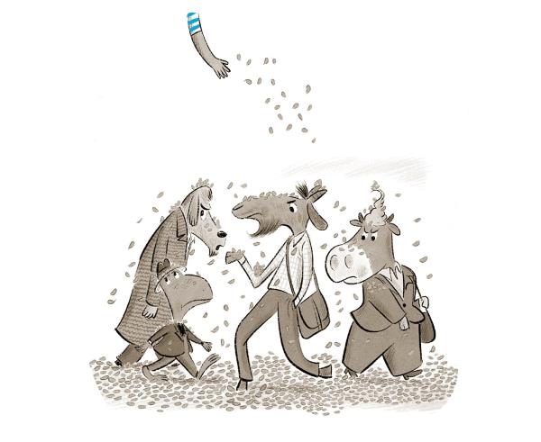 Геркулес сел на пол и высыпал все монетки из зелёного носка. Десять центов, ещё десять центов, плюс ещё десять центов и плюс ещё десять центов.
