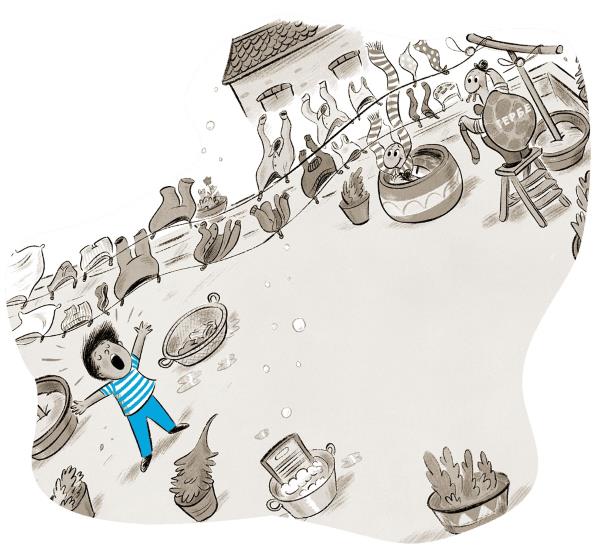 Майк забрался в пустой цветочный горшок, чтобы спрятаться от ветра, а Герберт поднялся на маленькую стремянку, чтобы развешивать одежду.