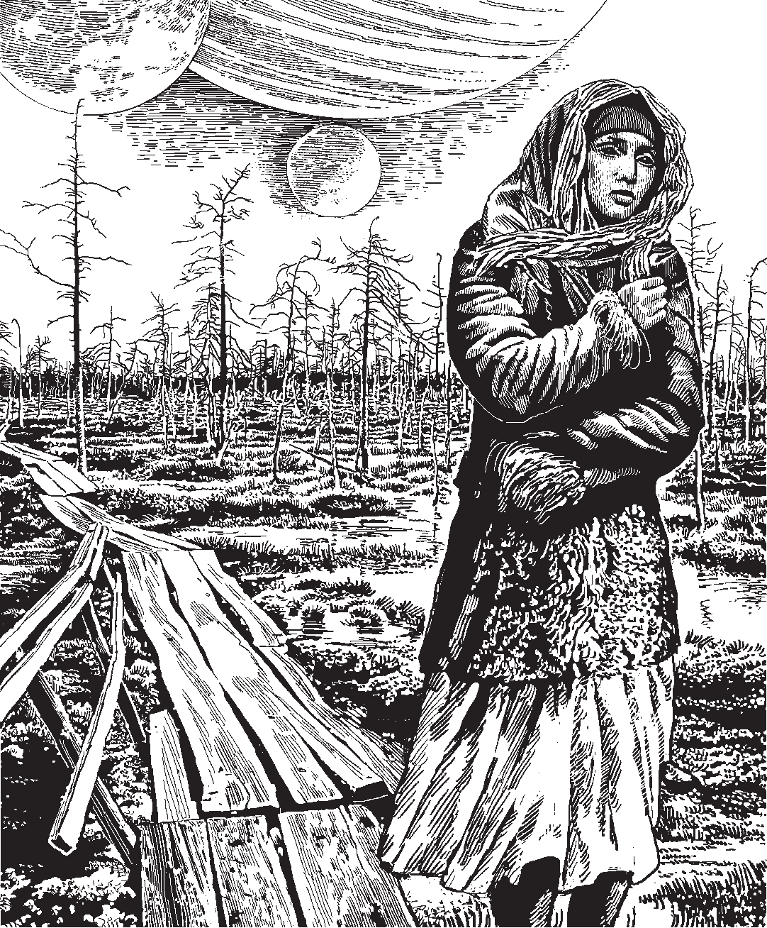 Она вышла за калитку и побрела по деревянным мосткам, извивавшимся по болоту, к деревне.