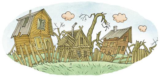 Никогда в жизни ещё не видела она таких улиц: заборы поломаны, дома покосились, ржавые трубы погнуты… Как будто тут пронёсся ураган или стадо диких слонов. На заборе напротив она разглядела нацарапанную гвоздём надпись: