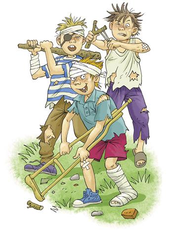 И вдруг с громкими воплями из пролома в заборе высыпала толпа мальчишек. Все в рваной одежде, с синяками и царапинами, забинтованными головами и руками. А впереди всех – на одной ноге в гипсе, размахивая костылём, – скакал предводитель.