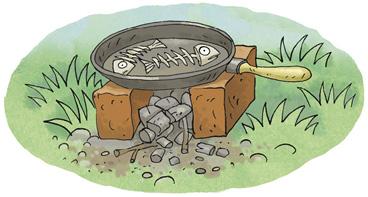 Малуся растерялась. Неподалёку горел костёр, а на огне жарилась рыба на сковородке.