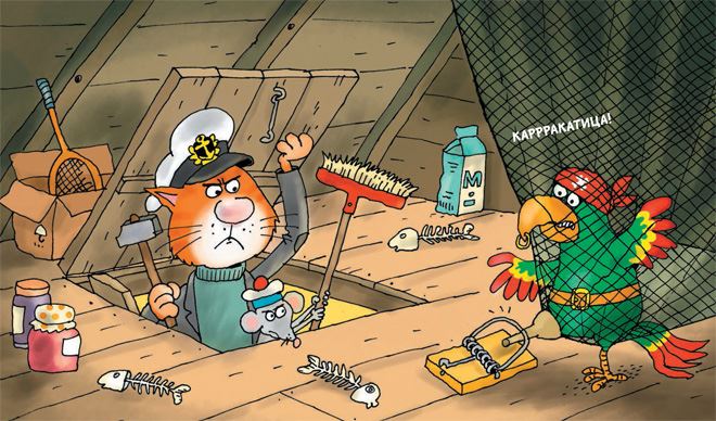 Но в сетях запутался попугай. К тому же одноногий: на деревянном протезе болталась мышеловка.